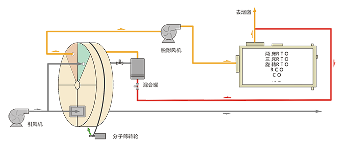 工艺简介: 经过预处理的废气进入沸石浓缩转轮+催化燃烧系统,利用沸石分子筛的多孔吸附性将有机物吸附浓缩,浓缩后的有机物在300~400℃的温度和催化剂的作用下将有机组分中的C、H化合物氧化分解成无害的CO2和H2O等,达到净化空气的目的。 技术原理: 经预处理(去除粉尘、颗粒物)后的有机废气流过浓缩转轮时,其中的有机物在转轮吸附区域会被吸附下来,经过吸附净化后的废气(约占处理风量的85%~95%)排放到大气中,一小部分废气(约占处理风量的5%~15%)对转轮冷却区降温后经换热器被加热到180~220℃的脱附温度后,流入脱附区,脱附区有机物从吸附剂—沸石上脱离到加热的气流中,转轮得以再生,脱附后的高浓度VOCs被送入催化燃烧。脱附产生的浓缩废气在进入催化床层之前,与高温烟气首先在换热器单元进行换热,预热脱附废气并进入催化床。脱附气体在催化床内升至300℃,进行催化氧化反应,有机成分被氧化成无毒无害的CO2和H2O,并放出热量。形成的烟气(<650℃)在排出时与进气进行换热后,达标排放。 试用工况: 中等风量、中低浓度的有机废气。 技术特点: 设备处理能力大、压力损失小、氧化温度低、转轮效率>95%、CO效率可达99%。 行业应用: 该工艺适用于石油废气处理、化工废气处理、橡胶废气处理、印刷油墨废气处理、喷涂废气处理、电缆及漆包线废气治理、家具废气治理、涂装喷漆废气处理等工业有机废气治理项目。